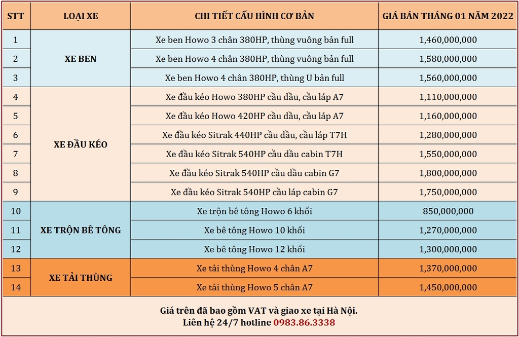Những tháng đầu năm 2022, các loại xe tải Howo nhập khẩu có tại thị trường Việt Nam là các loại xe sản xuất 2021. Xe sản xuất 2022 dự kiến sẽ về Việt Nam vào thời gian khoảng tháng 4.2022. Giá trên đã bao gồm VAT và giao xe tại Hà Nội.