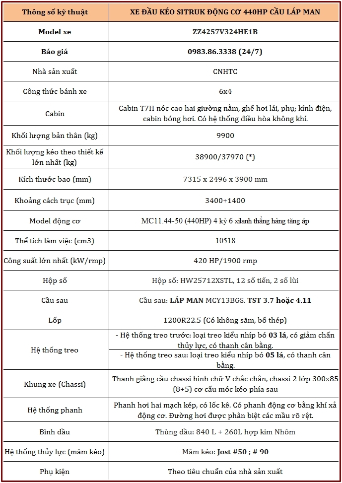 THÔNG SỐ KỸ THUẬT ĐẦU KÉO HOWO T7H SITRAK 440H CẦU LÁP