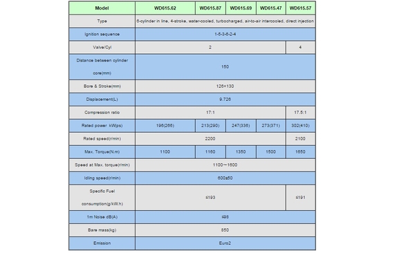 Thực tế hiện tại từ trước tới giờ đa phần chỉ có 4 dải model động cơ được sử dụng: WD615.47; WD615.69; WD615.95; WD615.96 là các dạng động cơ 6 xi lanh thẳng hàng, tăng áp làm mát bằng nước. Tức động cơ thông thường (không phải kim phun điện tử)