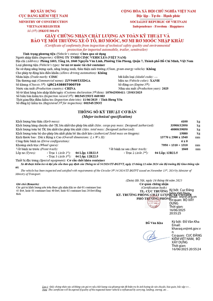 Đăng kiểm thông số kỹ thuật mooc xương 45 Feet CIMC