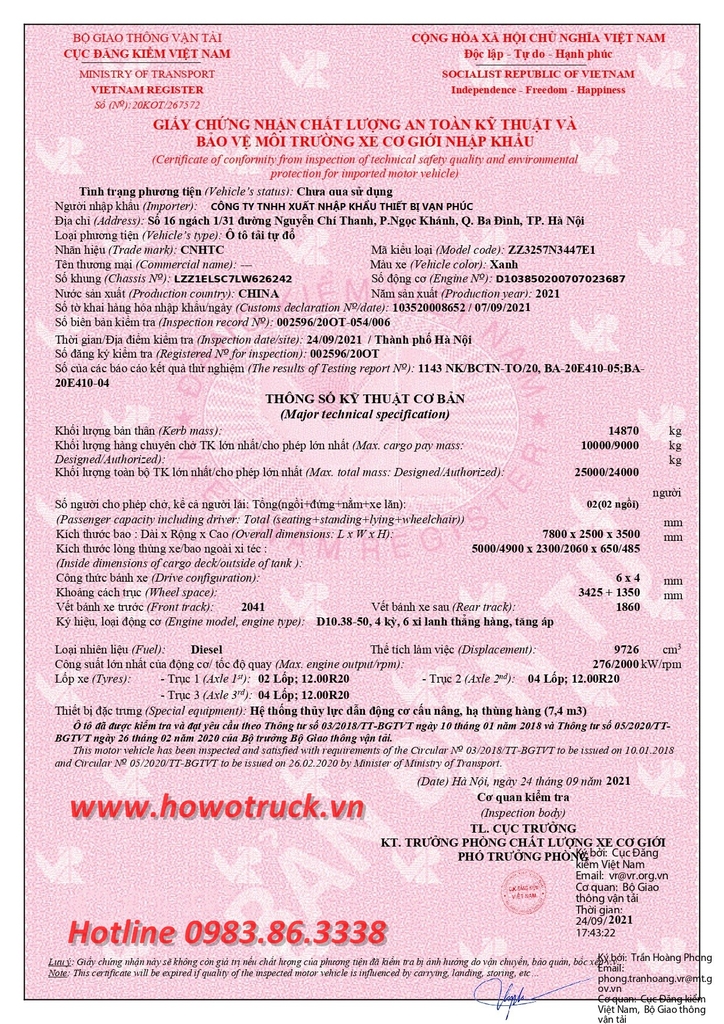 THÔNG SỐ KỸ THUẬT ĐĂNG KIỂM XE BEN 3 CHÂN HOWO